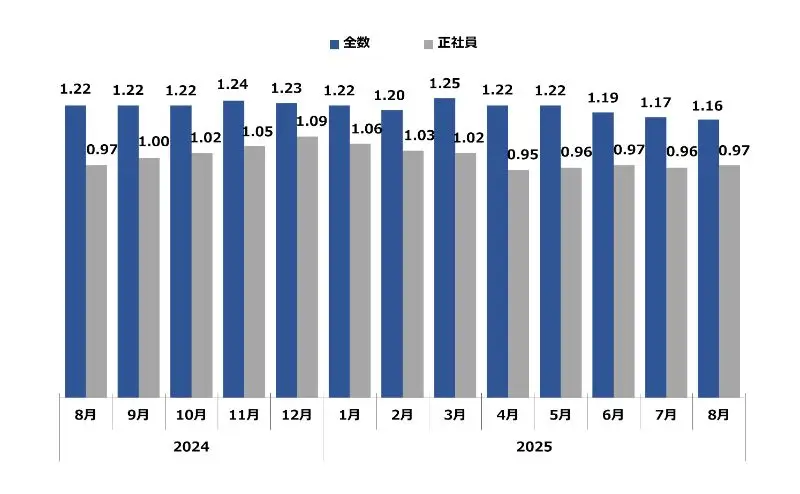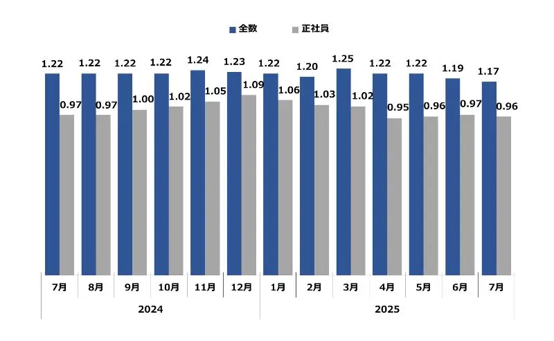 求職者1人に対する求人件数。倍率が1を超えるということは、求職者数よりも求人件数が多い(=採用難)ということを表します。