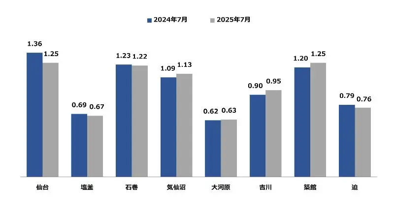 宮城県の7月の地域別有効求人倍率は、仙台と築館が最も高く1.25倍、次いで石巻が1.22倍となっております。
