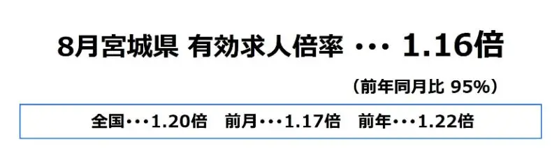 宮城県の8月の有効求人倍率は、1.16倍となり、前月より0.01ポイント下降、前年同月比では95%となっております。