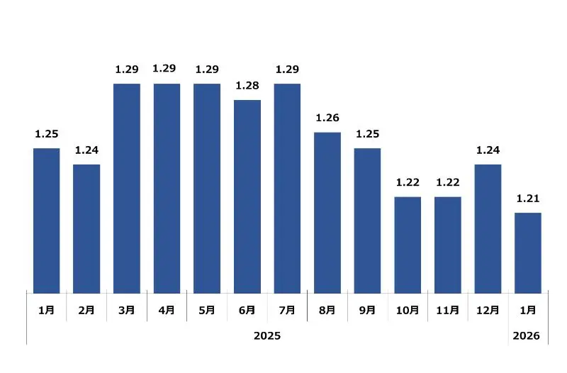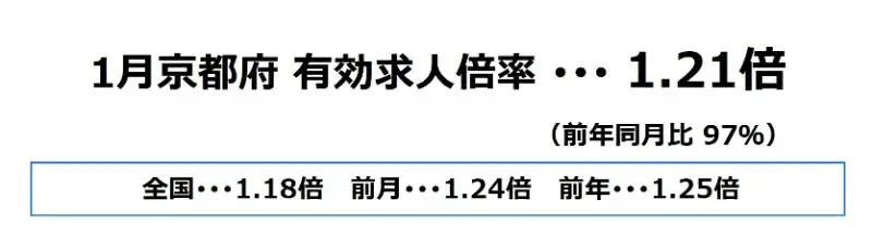 京都府の1月の有効求人倍率は、1.21倍となり前月より0.03ポイント下降、前年同月比では97%となっております。