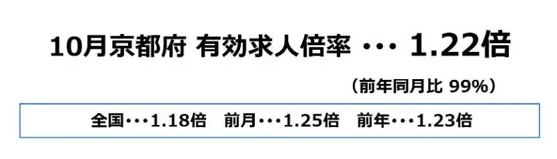京都府の10月の有効求人倍率は、1.22倍となり前月より0.03ポイント下降、前年同月比では99%となっております。
