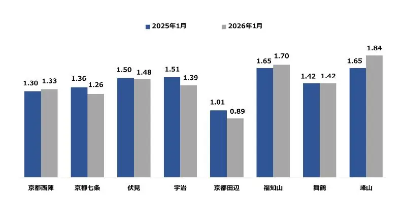 京都府の1月の地域別有効求人倍率は、峰山が最も高く1.84倍、次いで福知山が1.70倍となっております。