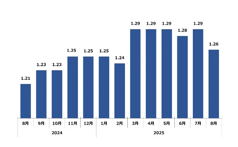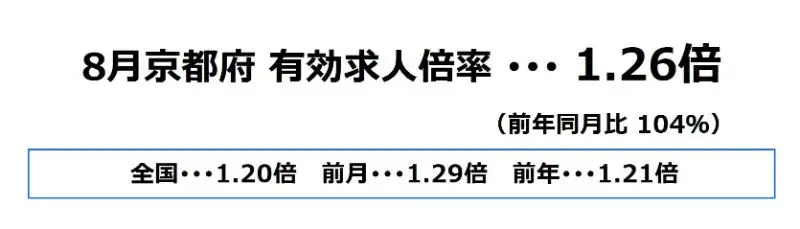 京都府の8月の有効求人倍率は、1.26倍となり前月より0.03ポイント下降、前年同月比では104%となっております。