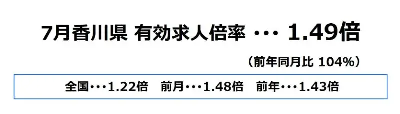 香川県の7月の有効求人倍率は、1.49倍となり、前月より0.01ポイント上昇、前年同月比では104%となっております。