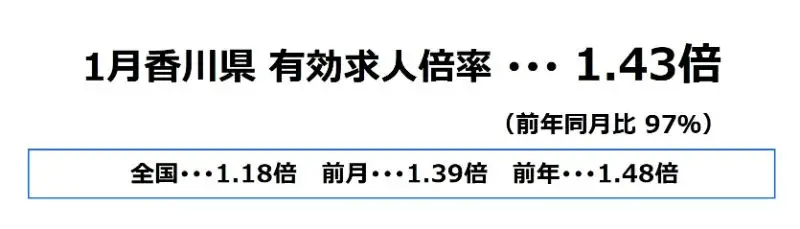 香川県の1月の有効求人倍率は、1.43倍となり、前月より0.04ポイント上昇、前年同月比では97%となっております。