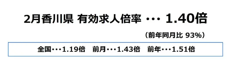 香川県の2月の有効求人倍率は、1.40倍となり、前月より0.03ポイント下降、前年同月比では93%となっております。