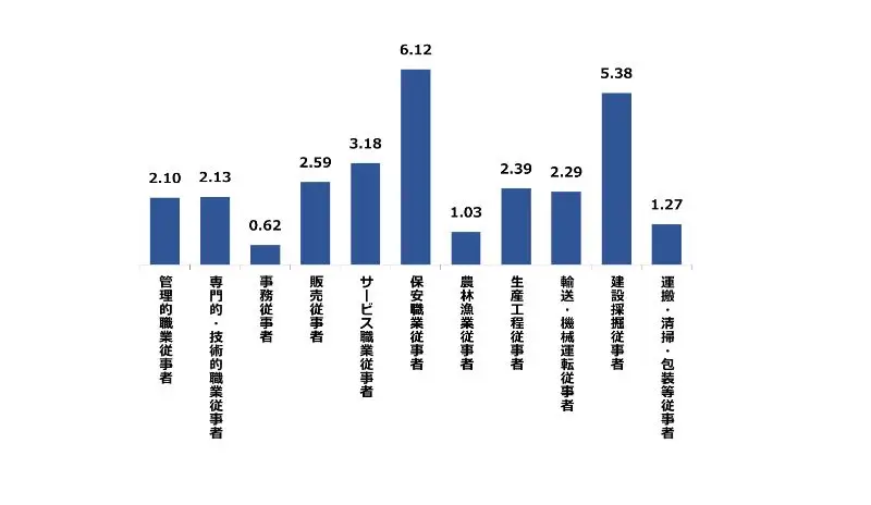 香川県の7月の職種別有効求人倍率は、保安職業従事者が6.12倍、建設採掘従事者が5.38倍と高くなっております。