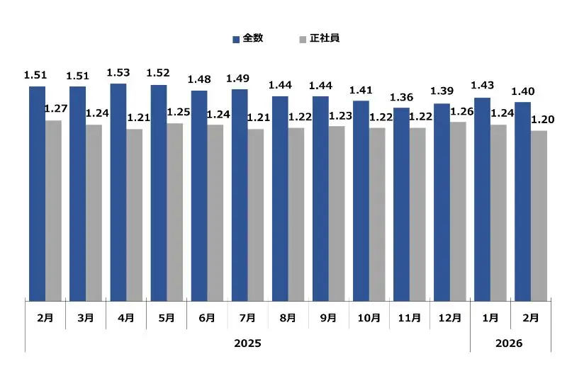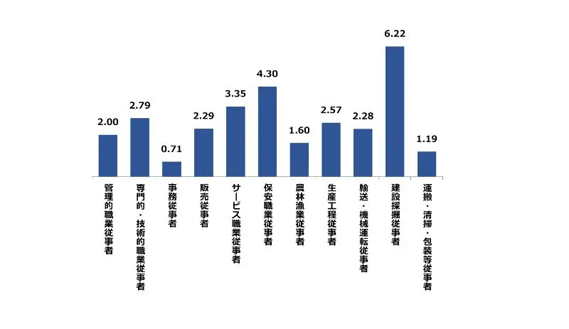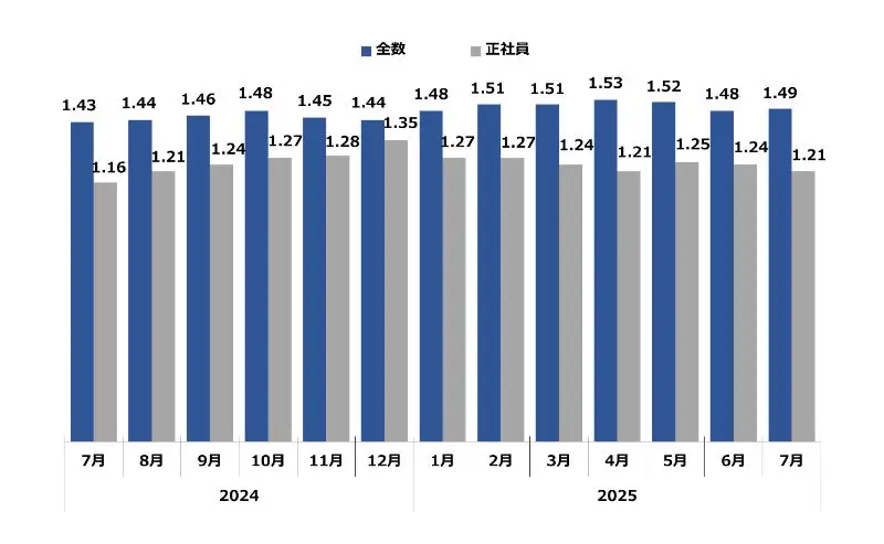 求職者1人に対する求人件数。倍率が1を超えるということは、求職者数よりも求人件数が多い(=採用難)ということを表します。