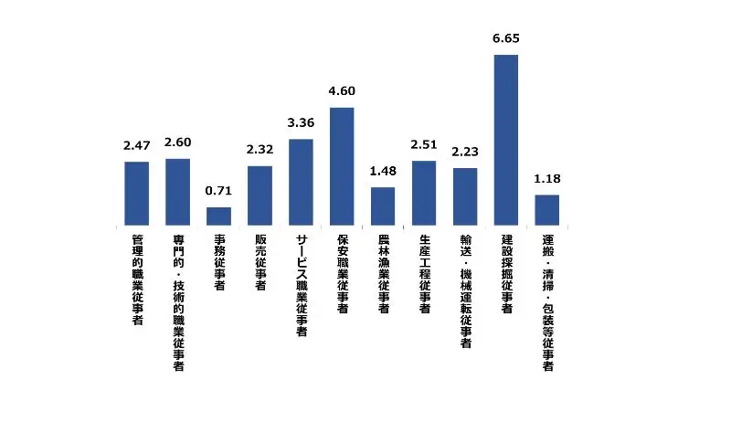 香川県の2月の職種別有効求人倍率は、建設採掘従事者が6.65倍、保安職業従事者が4.60倍と高くなっております。