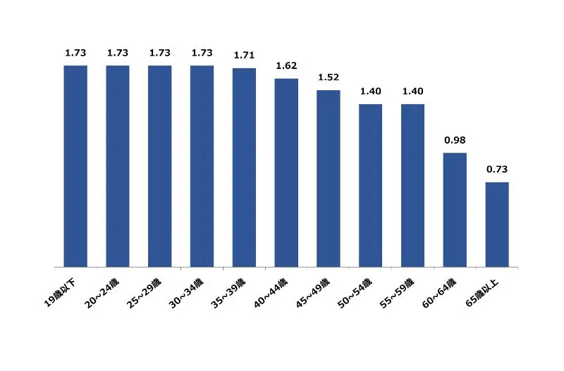 香川県の2月の年齢別有効求人倍率は、19歳以下、20〜24歳、25~29歳、30〜34歳が1.73倍、35〜39歳が1.71倍と高くなっております。