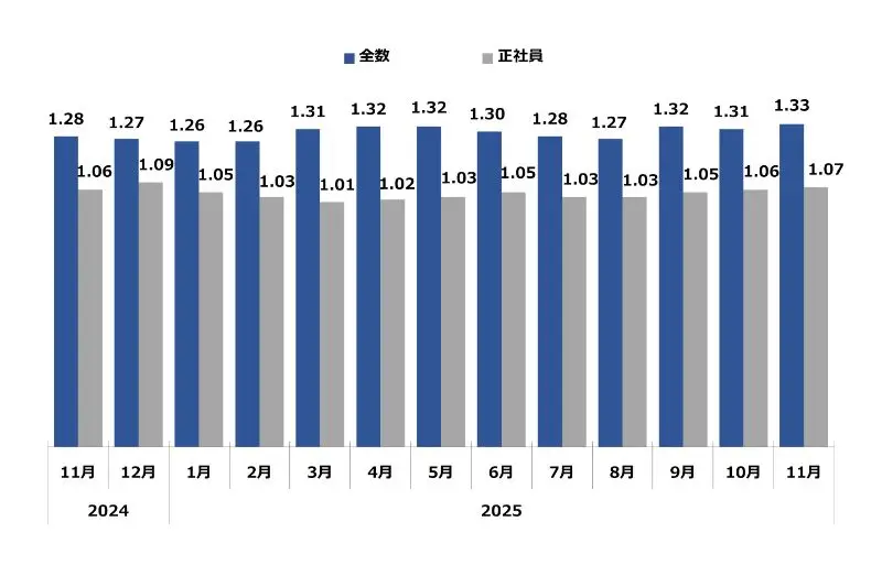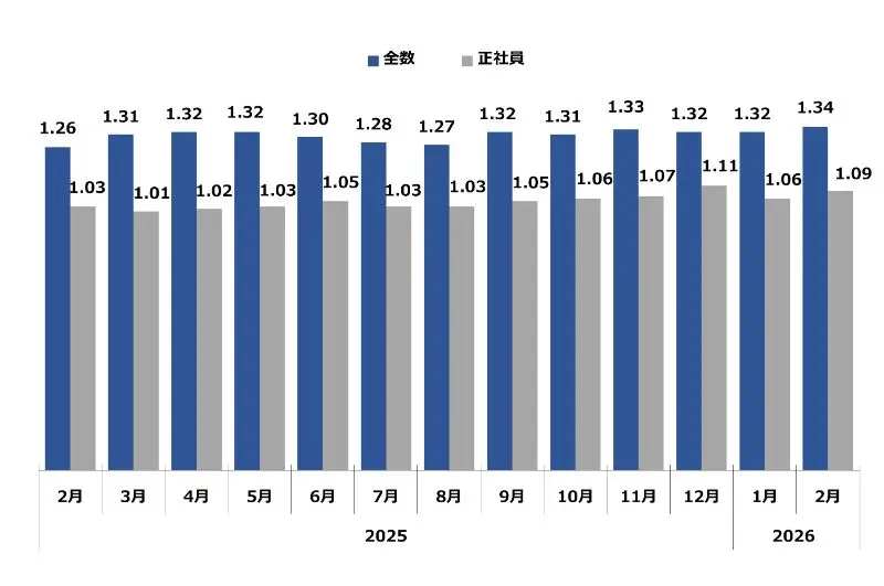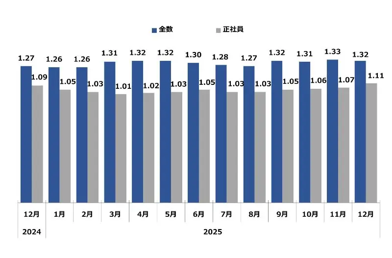 求職者1人に対する求人件数。倍率が1を超えるということは、求職者数よりも求人件数が多い(=採用難)ということを表します。