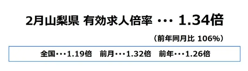 山梨県の2月の有効求人倍率は、1.34倍となり、前月より0.02ポイント上昇、前年同月比では106%となっております。