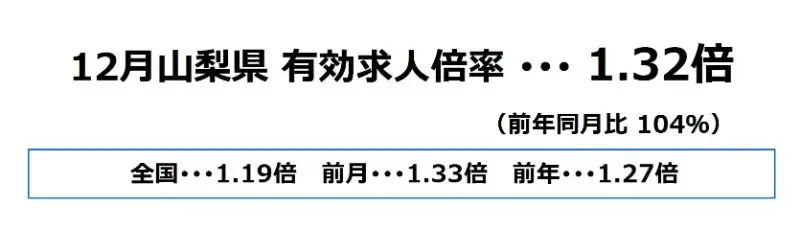 山梨県の12月の有効求人倍率は、1.32倍となり、前月より0.01ポイント下降、前年同月比では104%となっております。
