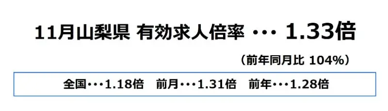 山梨県の11月の有効求人倍率は、1.33倍となり、前月より0.02ポイント上昇、前年同月比では104%となっております。