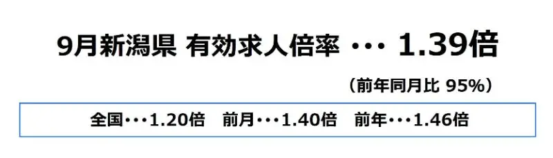 新潟県の9月の有効求人倍率は、1.39倍となり、前月より0.01ポイント下降、前年同月比では95%となっております。