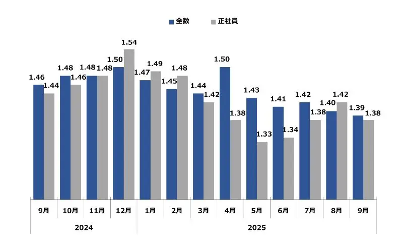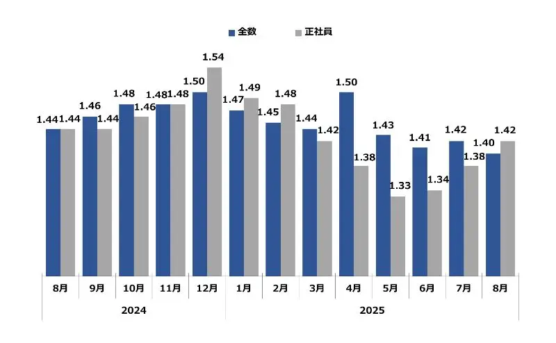 求職者1人に対する求人件数。倍率が1を超えるということは、求職者数よりも求人件数が多い(=採用難)ということを表します。