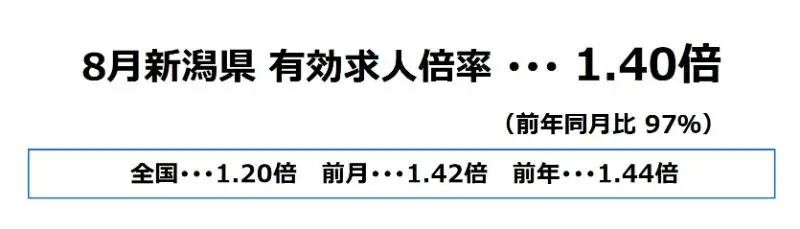 新潟県の8月の有効求人倍率は、1.40倍となり、前月より0.02ポイント下降、前年同月比では97%となっております。