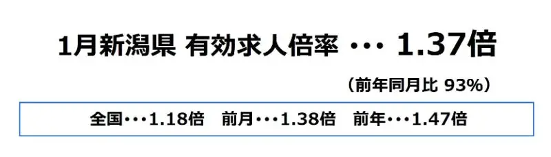 新潟県の1月の有効求人倍率は、1.37倍となり、前月より0.01ポイント下降、前年同月比では93%となっております。