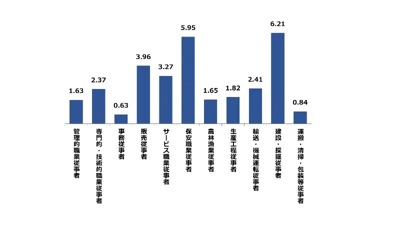 石川県の1月の職種別有効求人倍率は、建設・採掘従事者が6.21倍、保安職業従事者が5.95倍と高くなっております。