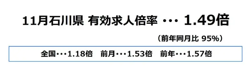 石川県の11月の有効求人倍率は、1.49倍となり、前月より0.04ポイント下降、前年同月比では95%となっております。