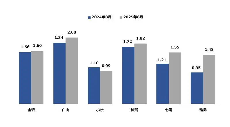 石川県の8月の地域別有効求人倍率は、白山が最も高く2.00倍、次いで加賀が1.82倍と高くなっております。