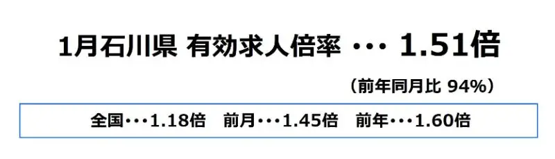 石川県の1月の有効求人倍率は、1.51倍となり、前月より0.06ポイント上昇、前年同月比では94%となっております。