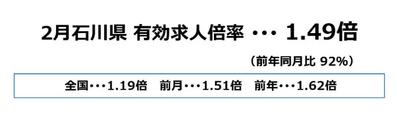 石川県の2月の有効求人倍率は、1.49倍となり、前月より0.02ポイント下降、前年同月比では92%となっております。