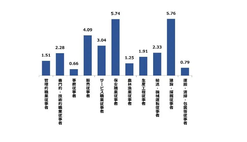 石川県の2月の職種別有効求人倍率は、建設・採掘従事者が5.76倍、保安職業従事者が5.74倍と高くなっております。