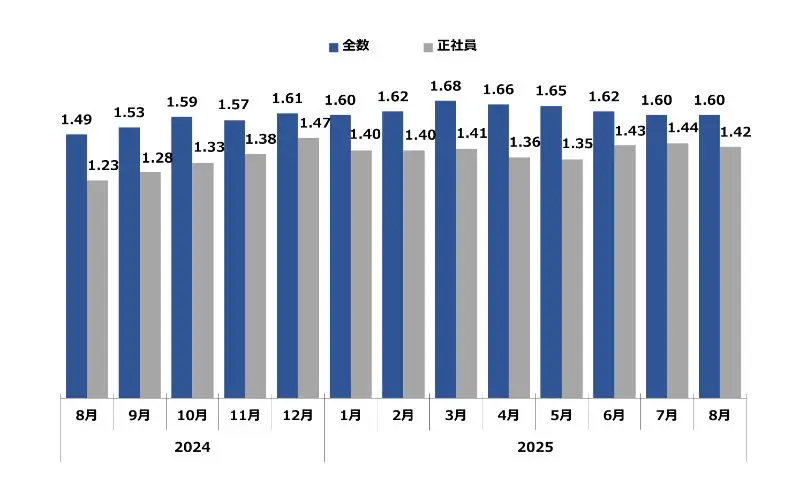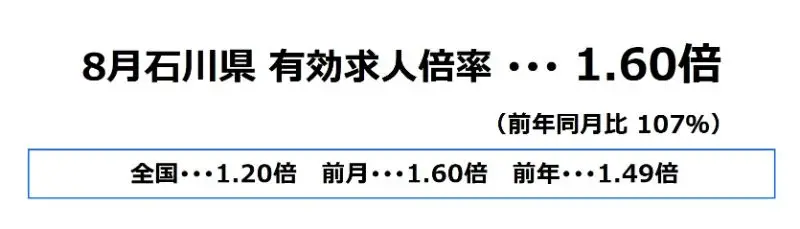 石川県の8月の有効求人倍率は、1.60倍となり、前月と同水準、前年同月比では107%となっております。