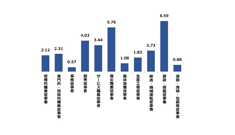 石川県の11月の職種別有効求人倍率は、建設・採掘従事者が6.59倍、保安職業従事者が5.76倍と高くなっております。