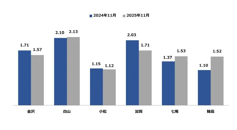 石川県の11月の地域別有効求人倍率は、白山が最も高く2.13倍、次いで加賀が1.71倍と高くなっております。