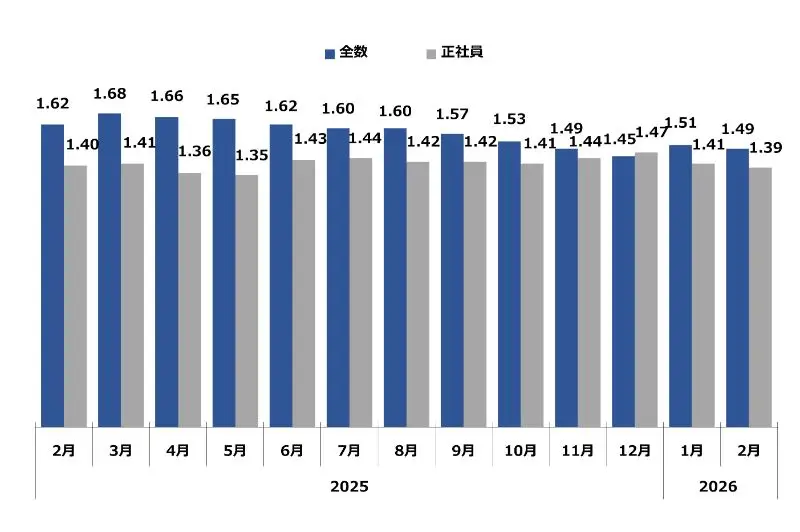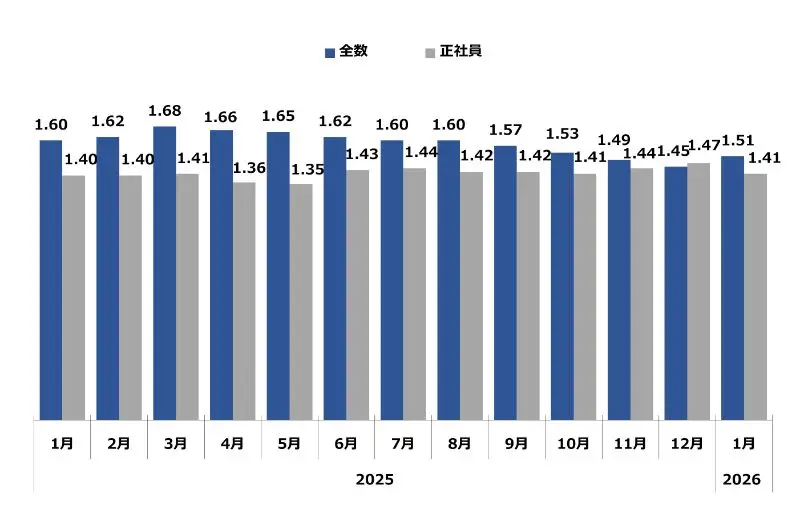求職者1人に対する求人件数。倍率が1を超えるということは、求職者数よりも求人件数が多い(=採用難)ということを表します。