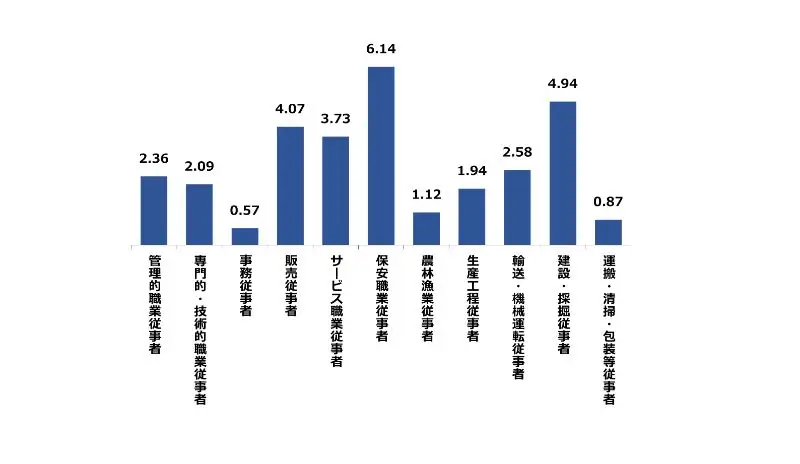 石川県の8月の職種別有効求人倍率は、保安職業従事者が6.14倍、建設・採掘従事者が4.94倍と高くなっております。