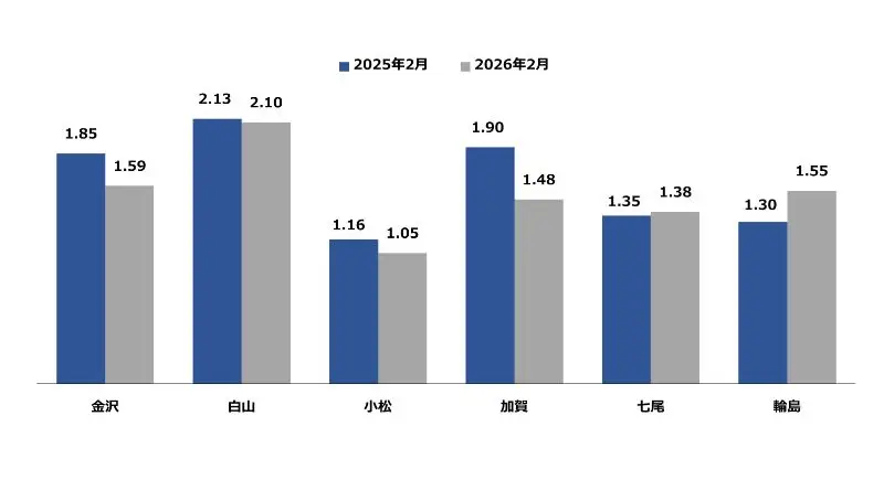 2026年4月現在、石川労働局からリリースされている2026年2月度の有効求人倍率データをまとめました。