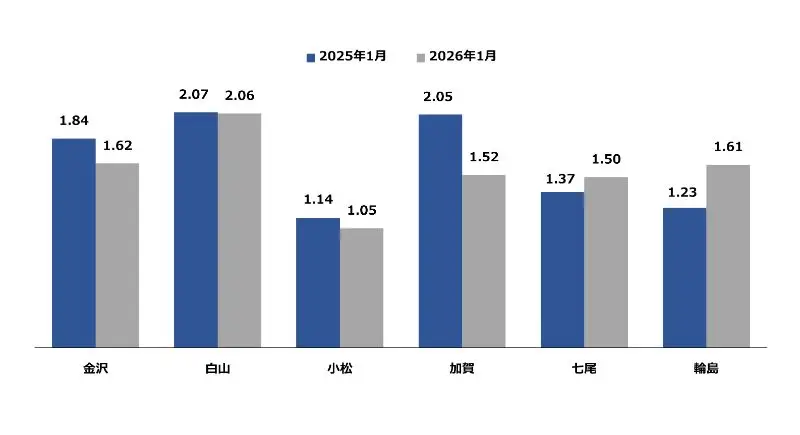 2026年3月現在、石川労働局からリリースされている2026年1月度の有効求人倍率データをまとめました。