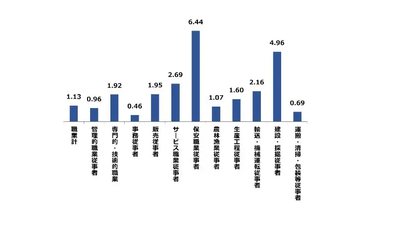 全国の2月の職種別有効求人倍率は、保安職業従事者が6.44倍、建設・採掘従事者が4.96倍と高くなっております。