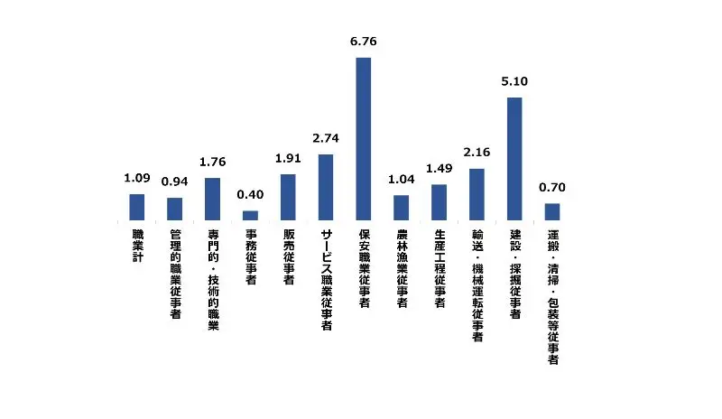 全国の8月の職種別有効求人倍率は、保安職業従事者が6.76倍、建設・採掘従事者が5.10倍と高くなっております。