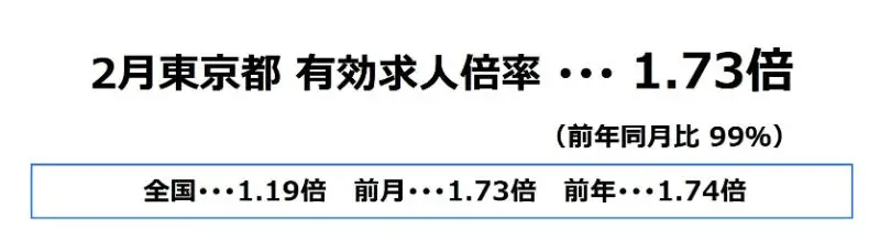 東京都の2月の有効求人倍率は、1.73倍となり、前月と同水準、前年同月比では99%となっております。