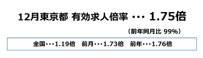 東京都の12月の有効求人倍率は、1.75倍となり、前月より0.02ポイント上昇、前年同月比では99%となっております。