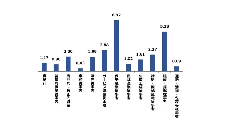 全国の12月の職種別有効求人倍率は、保安職業従事者が6.92倍、建設・採掘従事者が5.38倍と高くなっております。