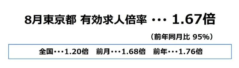東京都の8月の有効求人倍率は、1.67倍となり、前月より0.01ポイント下降、前年同月比では95%となっております。