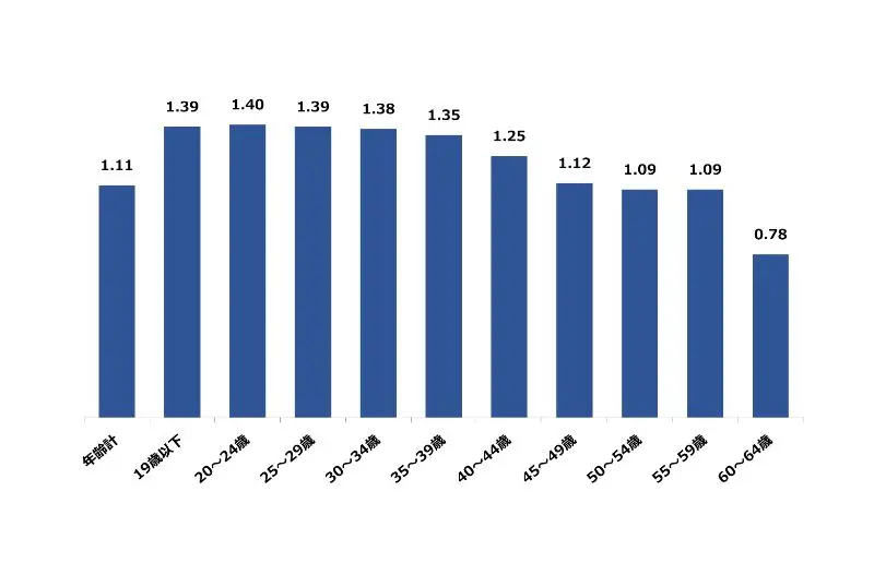 大阪府の11月の年齢別有効求人倍率は、20~24歳が最も高く1.40倍、次いで、19歳以下、25〜29歳が1.39倍となっております。