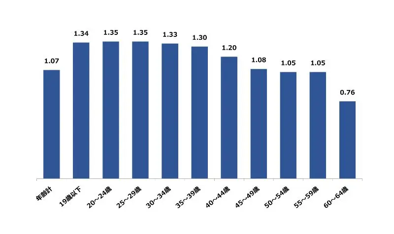 大阪府の8月の年齢別有効求人倍率は、20~24歳、25〜29歳が最も高く1.35倍、次いで、19歳以下が1.34倍となっております。