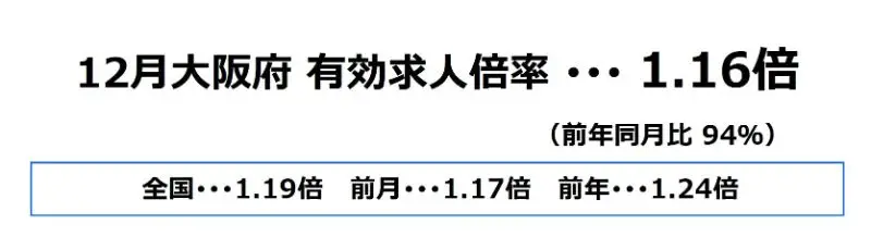 大阪府の12月の有効求人倍率は、1.16倍となり、前月より0.01ポイント下降、前年同月比では94%となっております。