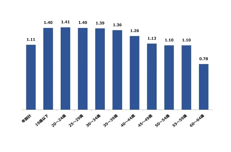 大阪府の1月の年齢別有効求人倍率は、20~24歳が最も高く1.41倍、次いで、19歳以下、25〜29歳が1.40倍となっております。