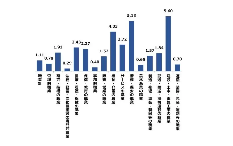 大阪府の1月の職種別有効求人倍率は、建設・土木・電気工事の職業が5.60倍、警備・保安の職業が5.13倍と高くなっております。