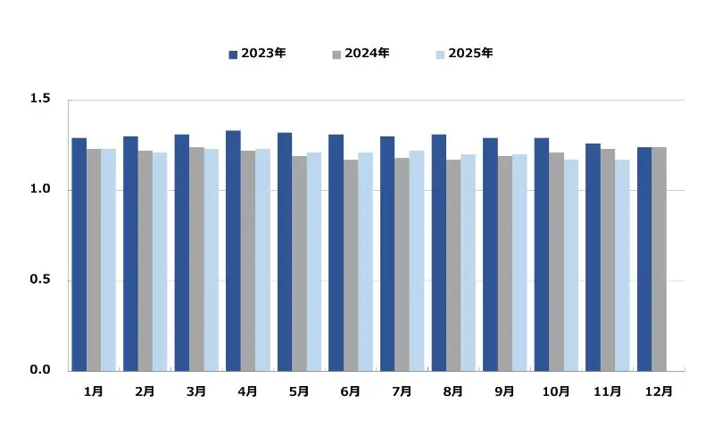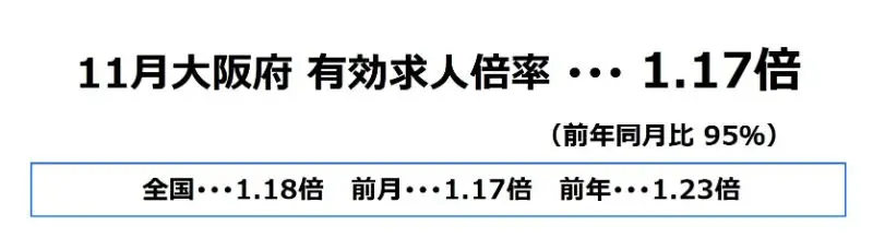大阪府の11月の有効求人倍率は、1.17倍となり、前月と同水準、前年同月比では95%となっております。