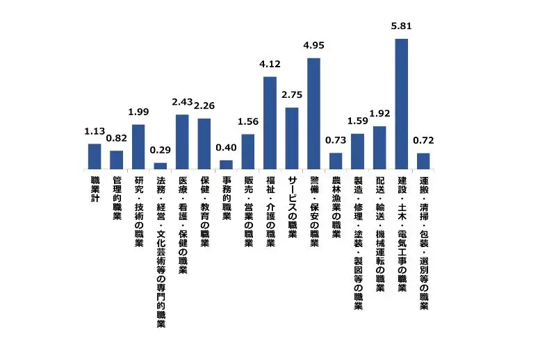 大阪府の12月の職種別有効求人倍率は、建設・土木・電気工事の職業が5.81倍、警備・保安の職業が4.95倍と高くなっております。