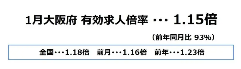 大阪府の1月の有効求人倍率は、1.15倍となり、前月より0.01ポイント下降、前年同月比では93%となっております。