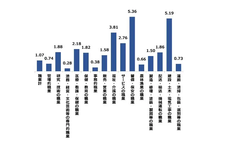 大阪府の8月の職種別有効求人倍率は、警備・保安の職業が5.36倍、建設・土木・電気工事の職業が5.19倍と高くなっております。